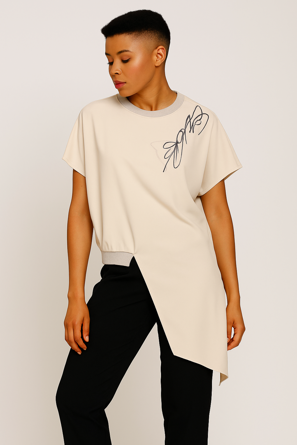 Elevate your everyday wardrobe with this uniquely structured beige blouse from BIZE. Crafted from lightweight fabric, it features a relaxed fit with a modern asymmetric hemline that creates movement and edge. The standout embroidered butterfly motif at the shoulder adds an artistic touch, while the ribbed knit crew neckline offers subtle contrast and structure. Perfect for pairing with tailored trousers or denim for a chic, effortless look.