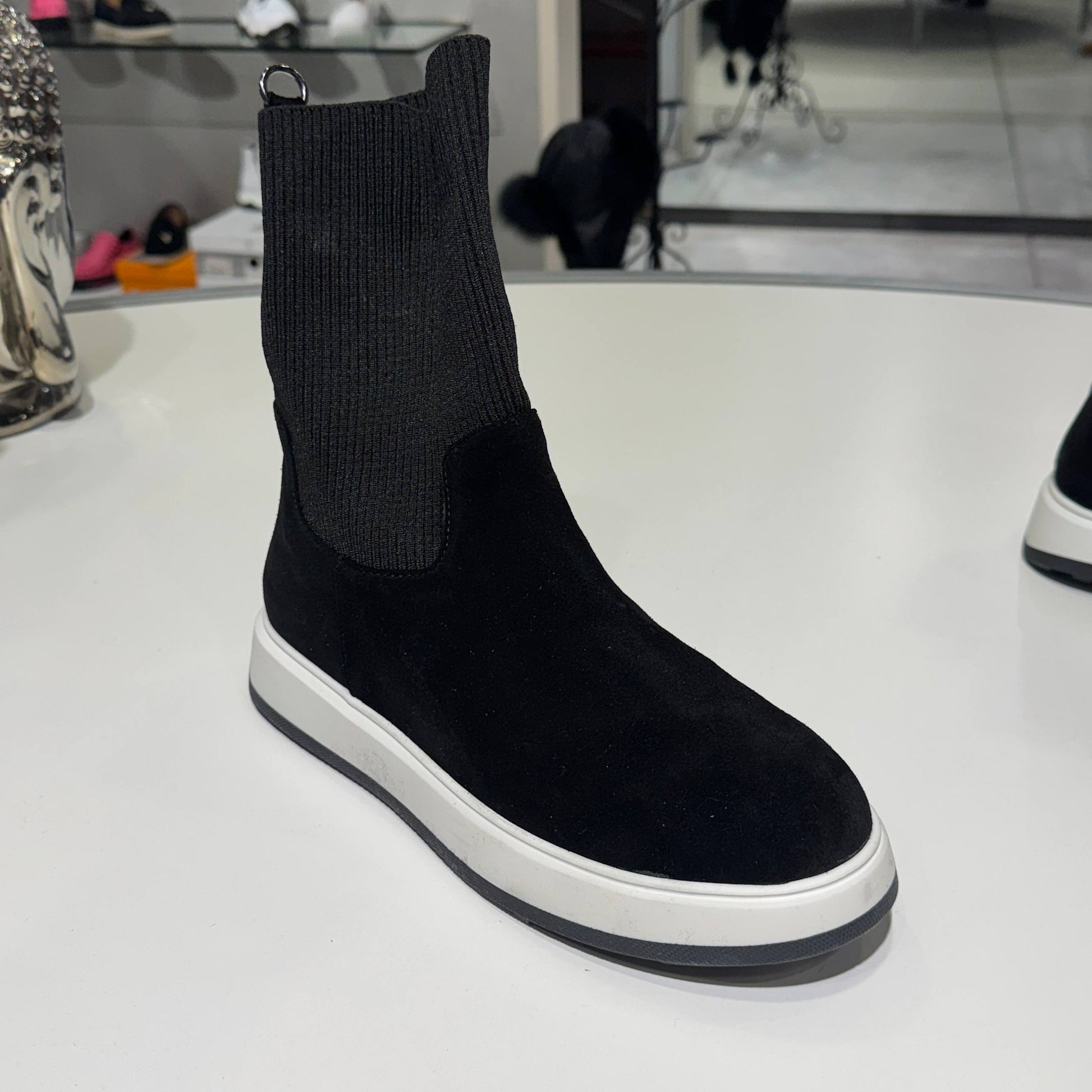A sleek, modern ankle boot with a minimalist silhouette and a sporty edge. This design combines a soft black suede lower with a stretch-knit sock-style shaft that hugs the ankle for a clean, streamlined look. The contrasting white sole adds a contemporary touch while providing lightweight cushioning and everyday comfort. Easy to slip on and effortlessly stylish, this boot is perfect for relaxed yet polished outfits.