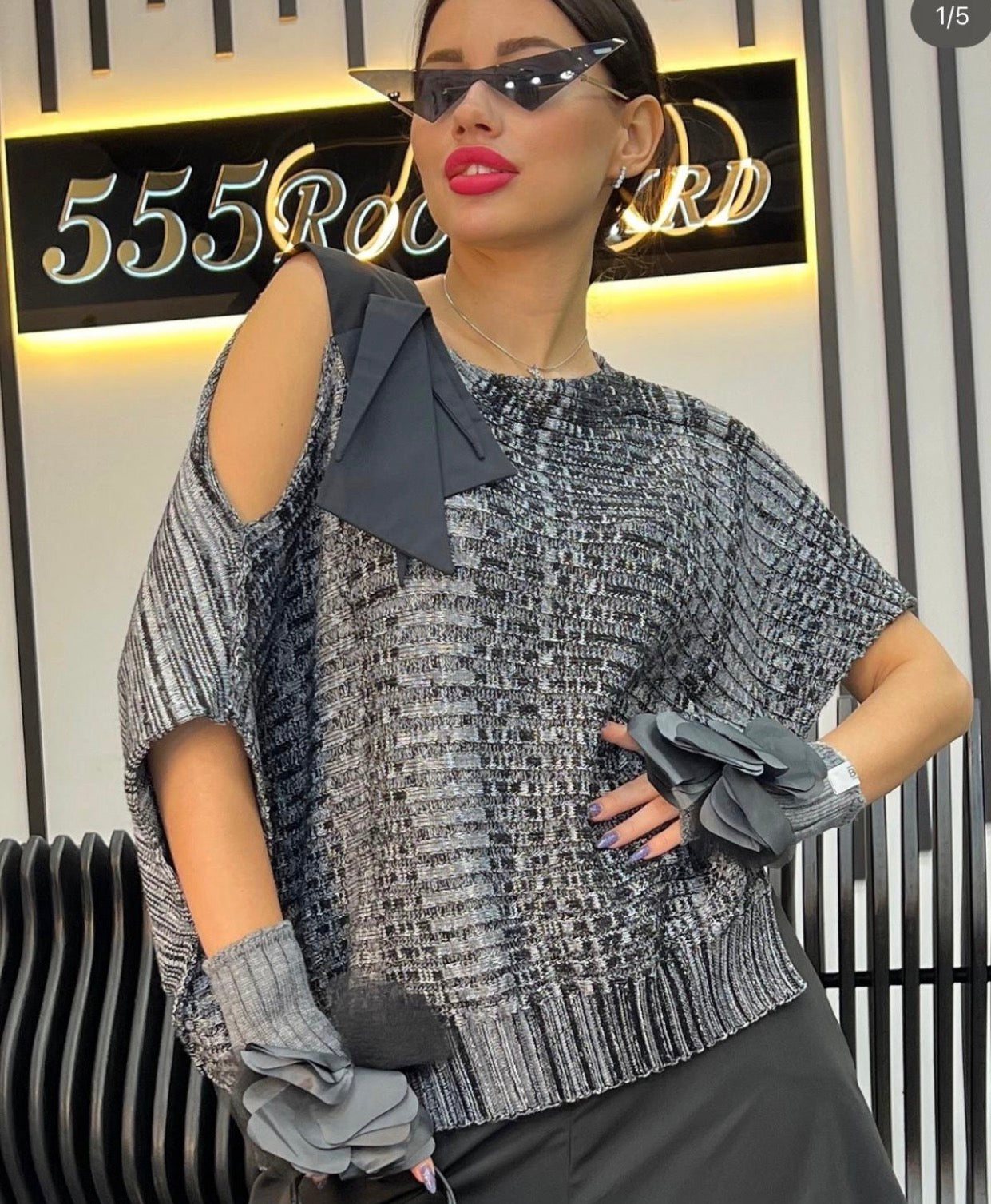 A modern knit blouse with stylish cold-shoulder cutouts and a relaxed oversized fit. Features a contrast bow detail at the neckline and ribbed hem for a flattering finish. The textured knit blends purple, green, and grey tones for a unique look.